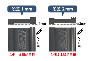 | 【備考】 | この定規は下敷テープを使用した時に下敷テープの厚みにより生まれる段差を解消する定規です。左右の足(クロスに接する部分)の段差はそれぞれ「1mm差」「2mm差」となり、クロスの厚みに合わせて使い分けることができます。それにより、クロスカット時にカッター刃の挿入角度が傾かない、又は目開きしにくい方へ入ります。 ■使用方法 定規側面にカッター刃が当たるように使用してください。 側面付近に記した"ライン"を目印にご使用ください。 (例)右手でカッターを使用する場合 ・1mm差:「1本線」を右側にしてご使用ください ・2mm差:「2本線」を右側にしてご使用ください |